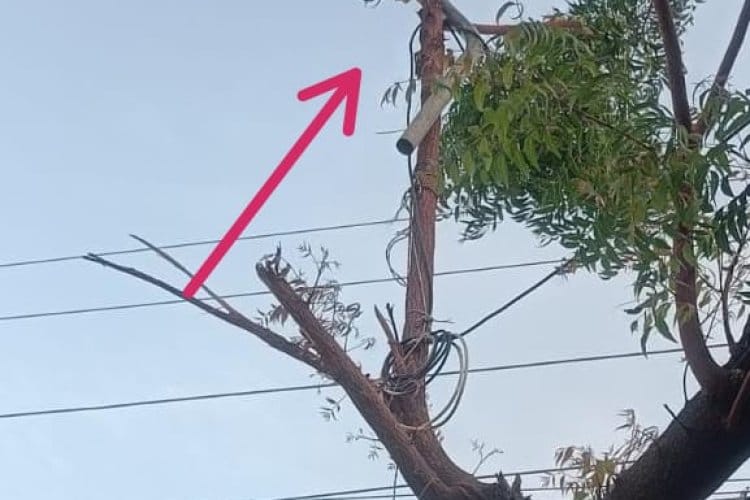మండల పరిషత్ కార్యాలయానికి సమీపంలో ఉన్న ఆర్టీసీ బస్టాండ్ వద్ద గల వేప చెట్టుకు గ్రామపంచాయతీ సిబ్బంది వీధిలైటును అమర్చారు. దీనితో ఎప్పుడు ఏ ప్రమాదం చోటుచేసుకుంటున్నానని గ్రామస్తులు భయాందోళన చెందుతున్నారు. బస్టాండ్ ఆవరణ కావటంతో బస్సుల కోసం వేచి చూసే ప్రయాణికులు చెట్టు కింద నిలబడి ఉంటారని, వర్షాకాలం కావడంతో చెట్టుకు ఆమార్చిన విద్యుత్ దీపం తీగల నుంచి షాట్ జరిగే ప్రమాదం ఉందని ప్రజలు ఆందోళన చెందుతున్నారు. విద్యుత్ స్తంభానికి ఏర్పాటు చేయవలసిన లైటును వేప చెట్టు