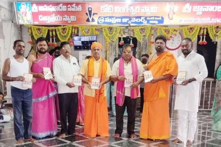 ముద్ర.వనపర్తి:- వనపర్తి జిల్లా కొత్తకోట మండలం కానాయపల్లి స్టేజి దగ్గర గల సుప్రసిద్ధమైన శైవక్షేత్రం శ్రీ కోటిలింగేశ్వరదత్తదేవస్థానము పదిహేడవ వార్షిక బ్రహ్మోత్సవాల కరపత్రాలను సోమవారం ఆలయకమిటి విడుదల చేశారు. బ్రహ్మోత్సవాలను ఈనెల 19 వతేదీ నాలుగు రోజుల పాటు జరుపుతామని అందులో బాగంగా మొదటి రోజు కాలభైరవ పాశుపత హోమాలు నిర్వహిస్తామని మొదటి రోజు కోటిలింగేశ్వర స్వామివారికి పుష్పాభిషేకం బిల్వాబిషేకం వుంటుంది మూడవ రోజు శ్రీజ్ఘానాంబికదేవికి పుష్పాభిషేకం వుంటుంది. కార్యక్రమంలో ధర్మకర్త రుమాళ్ మహేశ్వర్ ఆలయ గౌరవాధ్యక్షులు బి.మల్లికార్జునయ్యస్వామి ఆలయప్రధానకార్యదర్శి రుమాళ్ళశేఖర్ ఆలయ అర్చకులు జగదీష్ స్వామి అనిల్ స్వామి మరియు కొత్తకోట మండల యూత్ కాంగ్రెస్ అధ్యక్షుడు కరాటే శివలు ఉన్నారు.