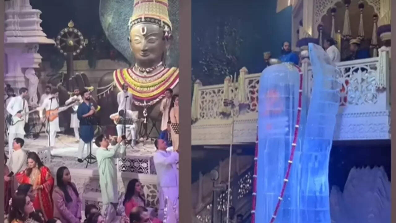 అమిత్ మరియు అతని బృందం వేదికపై ప్రదర్శన ఇవ్వగా, అనంత్ మరియు ముఖేష్ అంబానీ పూజలు నిర్వహించారు. అనంత్ సంప్రదాయ నీలిరంగు కుర్తా ధరించగా, ముఖేష్ అంబానీ తెల్లని దుస్తులను ధరించి వేడుకను మరింత పెంచారు.